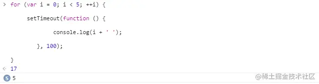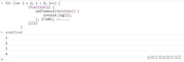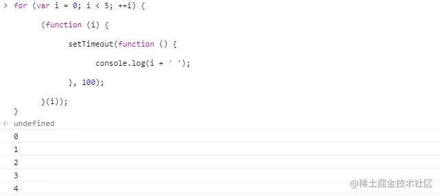 引入闭包来保存变量i,将setTimeout放入立即执行函数中,将for循环中的循环值i作为参数传递,100毫秒后同时打印出1 2 3 4 5