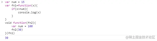 在这段代码中,函数fn1作为参数传入立即执行函数中,在执行到fn2(30)的时候,30作为参数传入fn1中,这时候if(x>num)中的num取的并不是立即执行函数中的num,而是取创建函数的作用域中的num这里函数创建的作用域是全局作用域下,所以num取的是全局作用域中的值15,即30>15,打印30.
