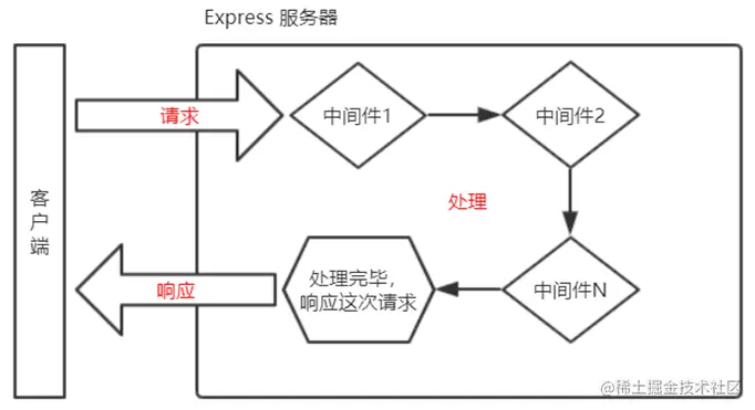 当一个请求到达Express的服务器之后,可以连续调用多个中间件,从而对这次请求进行预处理。
