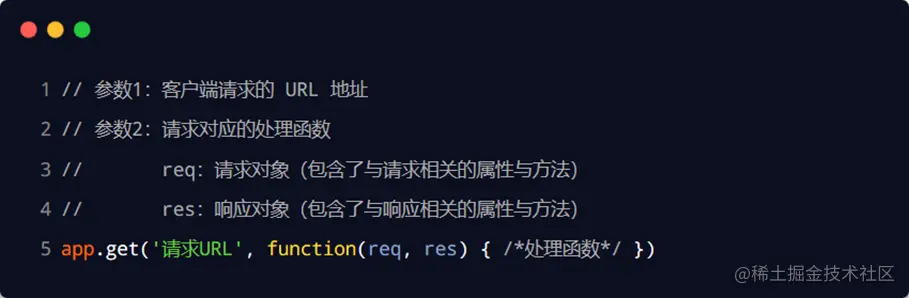 Express中的路由分3部分组成,分别是请求的类型、请求的URL地址、处理函数。