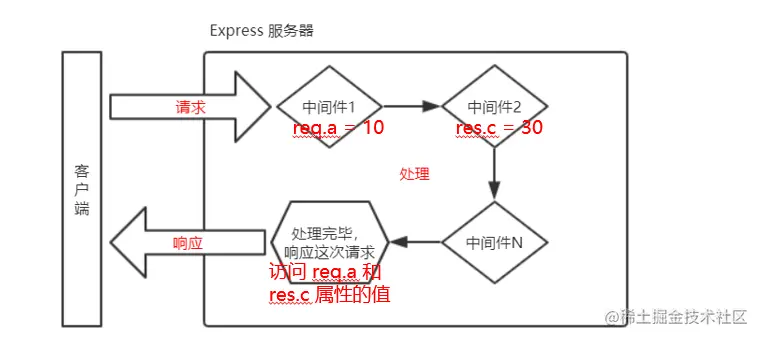 多个中间件之间,共享同一份req和res。基于这样的特性,我们可以在上游的中间件中,统一为req或res对象添