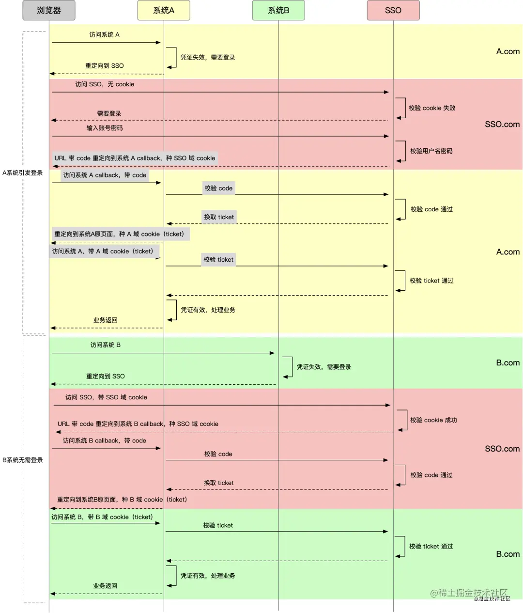 - 在 SSO 域下,SSO 不是通过接口把 ticket 直接返回,而是通过一个带 code 的 URL 重定向到系统 A 的接口上,这个接口通常在 A 向 SSO 注册时约定