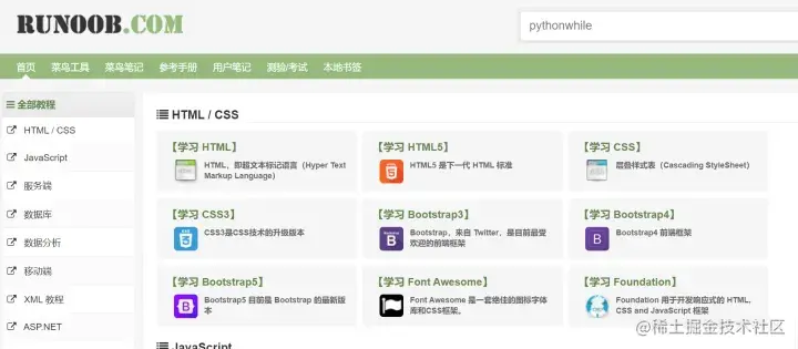 与菜鸟教程类似,涵盖从从基础的 HTML到CSS,乃至进阶的XML、SQL、 JS、 PHP 和 ASP.NET。不过个人认为,W3school的内容更丰富,而且还有微课这种模式,比较有意思。