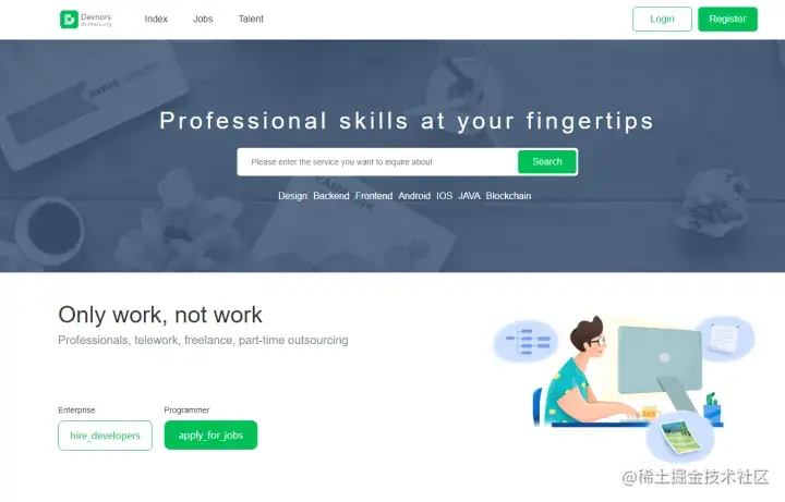 国内领先的中高端程序员自由工作平台,可以实现自由工作、远程工作、兼职工作。为中高端程序员提供稳定的线上工作机会,还有运营、设计等互联网岗位也有相应工作发布。