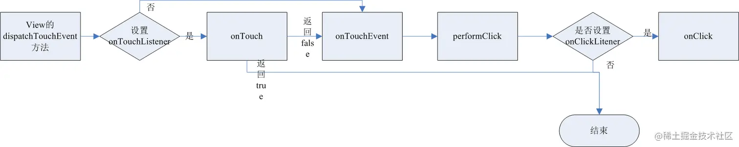 当一个View需要处理事件时,View的dispatchTouchEvent方法中,如果设置了OnTouchListener,那么OnTouchListener的onTouch方法会被调用,当onTouch方法返回true时,onTouchEvent就不会被调用,当onTouch方法返回false时,onTouchEvent方法就被调用,在onTouchEvent方法里面进入performClick方法,在performClick方法里面判断是否设置onClickListener,并且如果设置了onClickListener,那么onClick方法就被调用,performClick方法就返回true,如果没有设置了onClickListener,performClick方法就返回false。