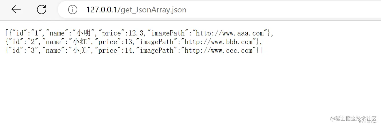 这时,在浏览器中访问http://127.0.0.1/get\_JsonArray.json这个网址,就会出现如下内容