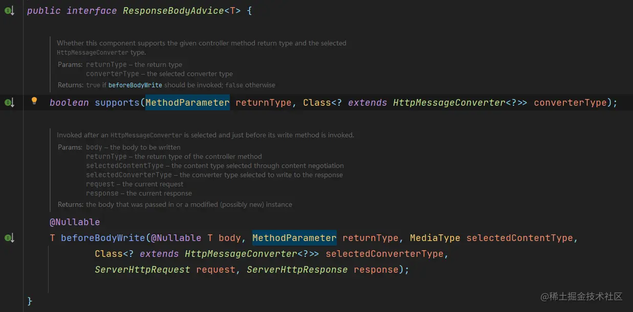 - 从名字就可以看出来,这个方法就是用来判断过来的请求是否要走这个增强. 简单的说就是返回true执行beforeBodyWrite方法,返回false不执行