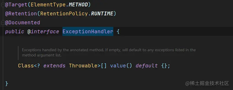 与@RestControllerAdvice配套使用,只有一个属性value,用于表示用此注解修饰的方法用来捕获什么类型的异常