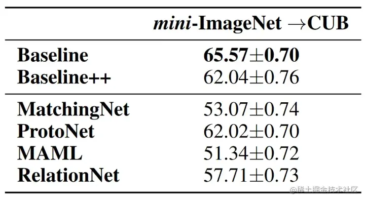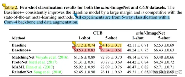 **baseline的改进版baseline++**训练过程与baseline一致,仍有和,但不再使用线性分类器。以为例,可视为c个类别的d维原型表示,所以可以通过计算样本特征与它的余弦相似度并使用softmax得到最终的预测概率分布。得到的预测结果仍使用交叉熵分类损失。该分类器相比线性分类器可以进一步减少类内差异。下表对比了baseline,baseline++与经典元学习算法的对比,注意使用了数据增强。结果上看,baseline是打不过元学习算法的,而baseline++则可以掰掰手腕,这说明了在小样本分类问题中减少类内差异的重要性。