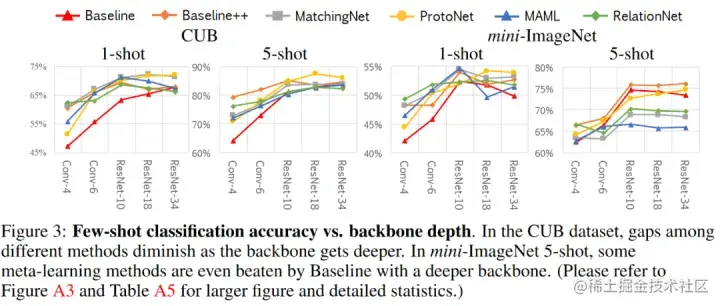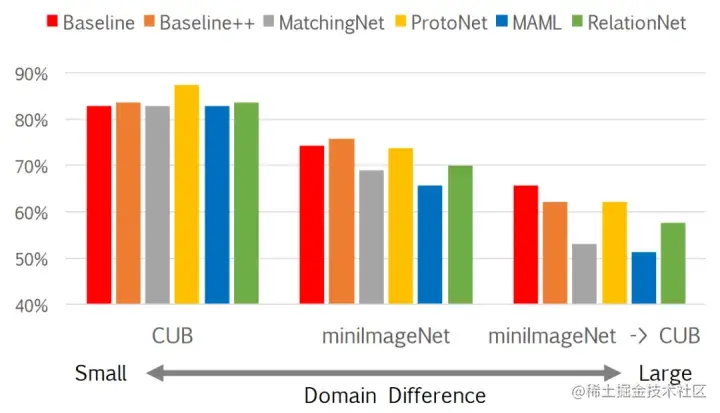 不过上表基于较浅的四层卷积网络进行实验的,当网络更deep且源域与目标域域间分布差异不大时,上表几种元学习和迁移学习方法的性能差异会缩小,但如果网络deep但域间差异较大,基于迁移学习的策略还是会呈现出优势,如下图:(ProtoNet还是稳健,不愧经典广流传)