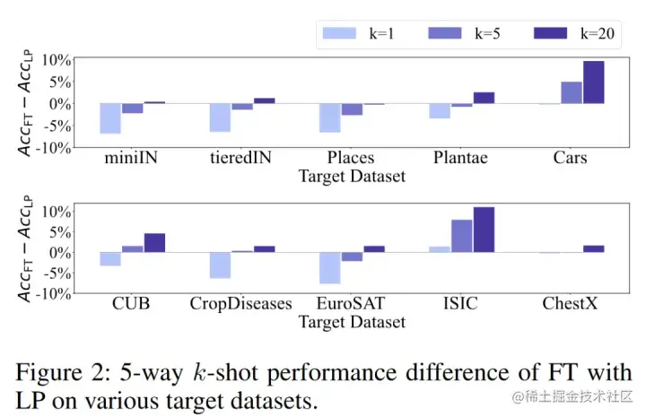 基于ConvNets经典的小样本图像分类文章[10]证明了基于距离分类器的baseline++可以打败很多sota meta-learning方法,验证了迁移学习在该项任务中的超能力。baseline及其改进版baseline++在微调时都固定了特征提取器(body)权重,而只微调分类器,二者只在分类器设计上有区别。标准的迁移学习pipeline中,全量的微调在有标签数据太少时效果不如linear probing,如下图,纵轴为全量fine-tuning准确率减去linear probing准确率的结果,横轴为不同数据集,不同颜色的柱状图标识不同的有标签数据量。我们看到在k很小时linear probing是更优的选择,k变大时,全量fine-tuning会逐渐夺回优势。