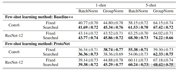 我们看到:affine参数的微调会带来task-specific收益,pretrain时若仅使用FN还会带来进一步收益。该结果也启发我们在小样本问题中,对源域分布信息的弱化以及对目标域分布信息的增强可能是行之有效的。另外,既然全量的微调会造成过拟合,微调特征提取器中的BN的参数这种partial形式带来了可观的收益,附着上一些额外参数也是很OK的,那么对其他部分参数的微调又会如何呢?是不是只要不是全量的,而是部分的,就能权衡好过拟合和task-specific之间的平衡?Partial is better than all[16]这项工作通过演化搜索来寻找在当前任务中微调哪部分参数,下表Searched表示其实验结果,性能收益也是比较稳定的。