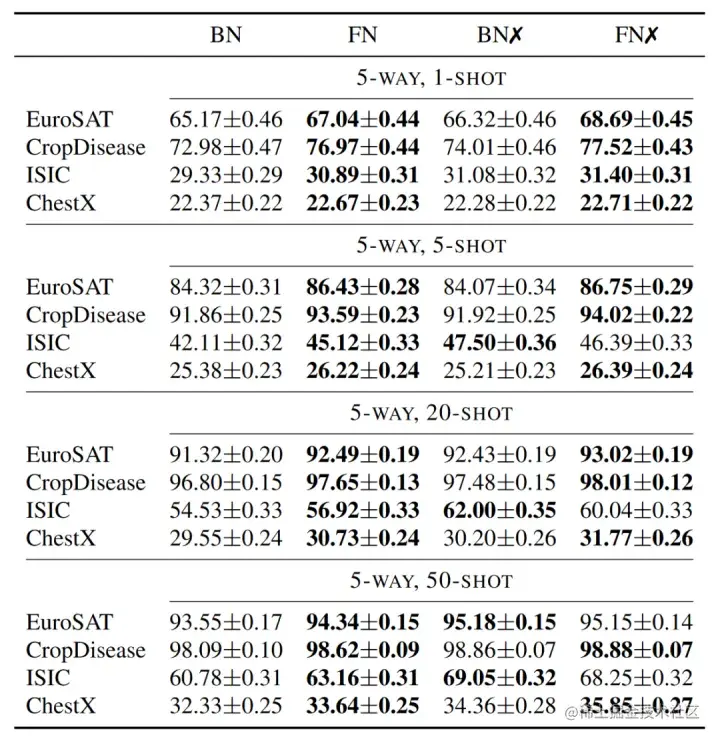 下表中:BN表示预训练时使用BN,微调时只微调分类头;FN表示预训练时只是用FN,微调时只微调分类头;BN✖️表示预训练使用BN,微调时微调分类头+affine参数;FN✖️表示预训练使用FN,微调时微调分类头+affine参数;