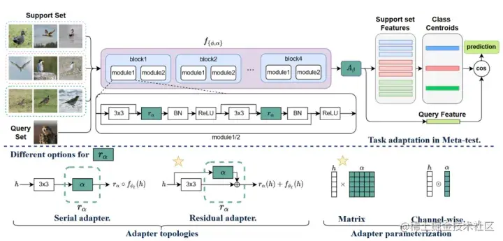 这种将部分参数附着在预训练网络上的工作是解决小样本问题行之有效的途径之一,类似的方案还有[6],该方法在ResNet中的每一个module上attach了一个task-specific模块,并在支持集上微调。下图为该方法的结构,其中为attach到resnet中的参数,是task-specific分类器参数。