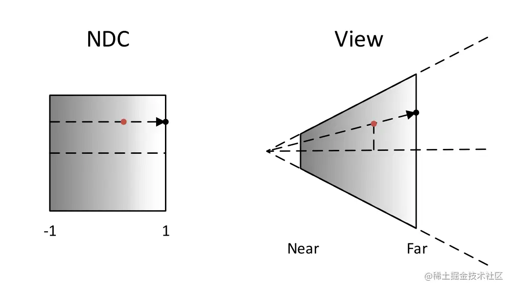然后将(NDC 空间下的)屏幕像素对应在摄像机 远平面(Far plane)的点转换到 裁剪空间(Clip space)。因为在 NDC 空间 中远平面上的点的 z 分量为 1,所以可以直接乘以摄像机的 far 值来将其转换到 裁剪空间