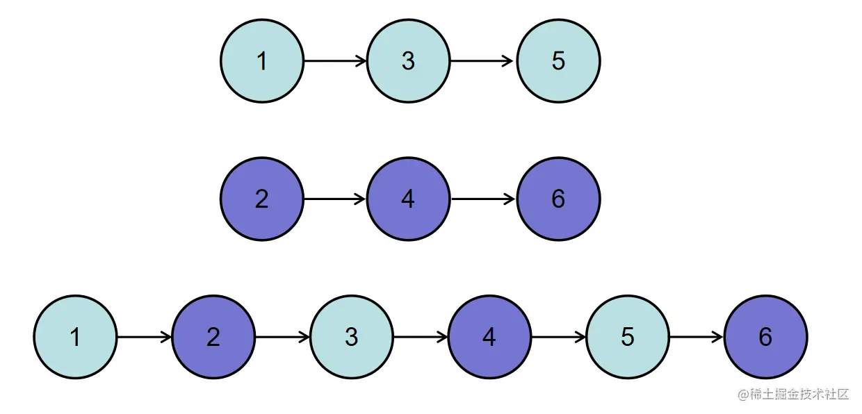 如输入{1,3,5},{2,4,6}时,合并后的链表为{1,2,3,4,5,6},所以对应的输出为{1,2,3,4,5,6},转换过程如下图所示: