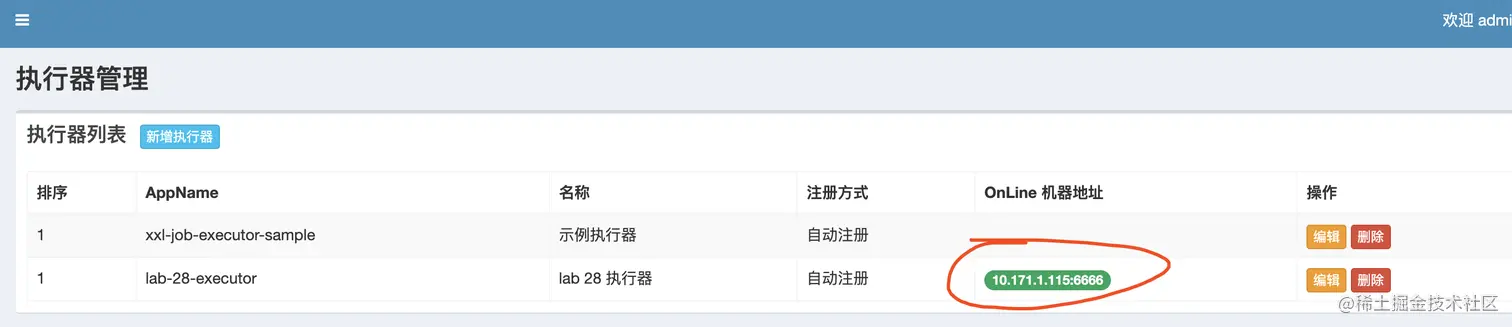 执行器的信息,点击「保存」按钮,进行保存。耐心等待一会,执行器会自动注册上来。如下图: