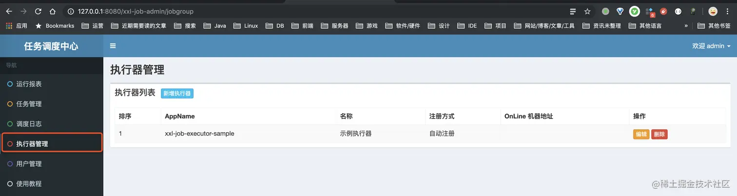 浏览器打开 http://127.0.0.1:8080/xxl-job-admin/jobgroup 地址,即「执行器管理」菜单。如下图: