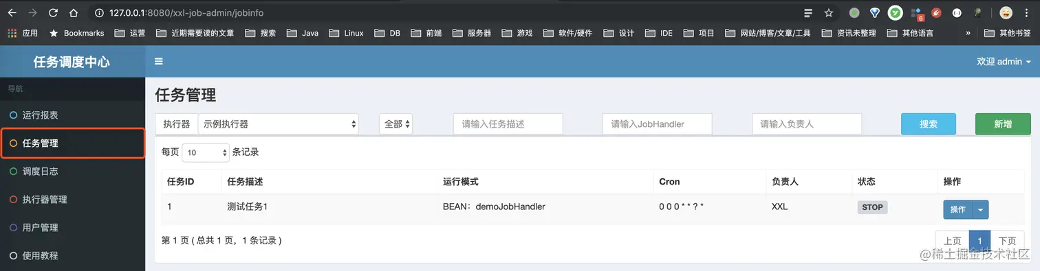 浏览器打开 http://127.0.0.1:8080/xxl-job-admin/jobinfo 地址,即「任务管理」菜单。如下图: