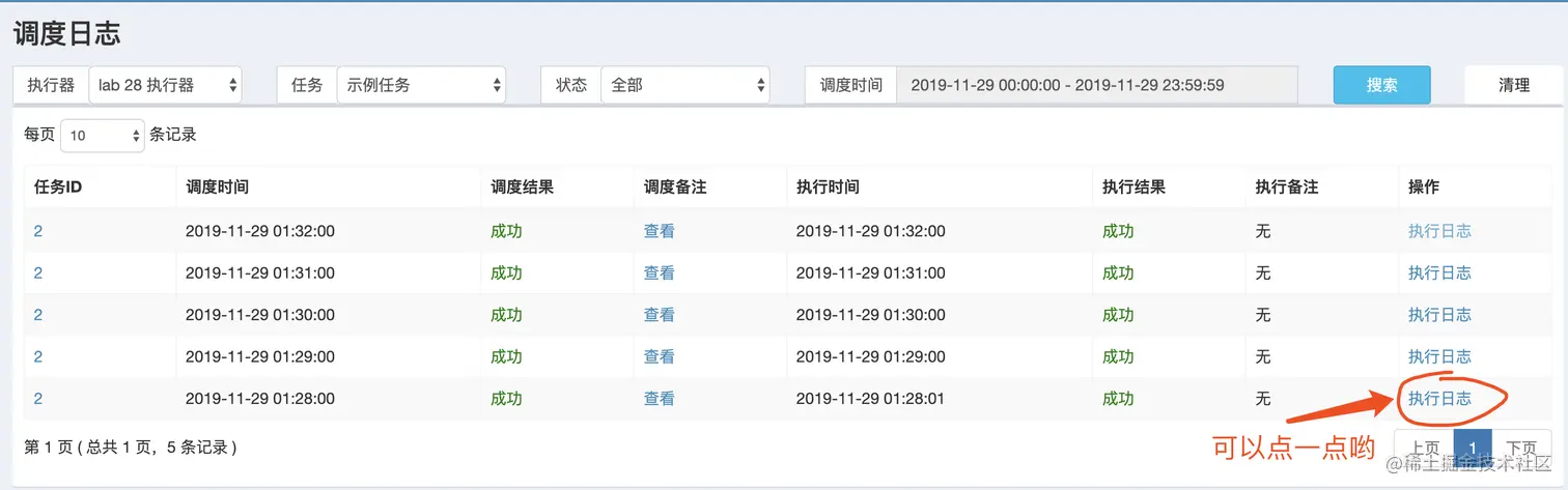 任务的「操作」按钮,选择「查询日志」,可以看到相应的调度日志。如下图: