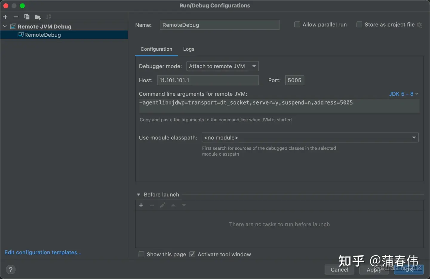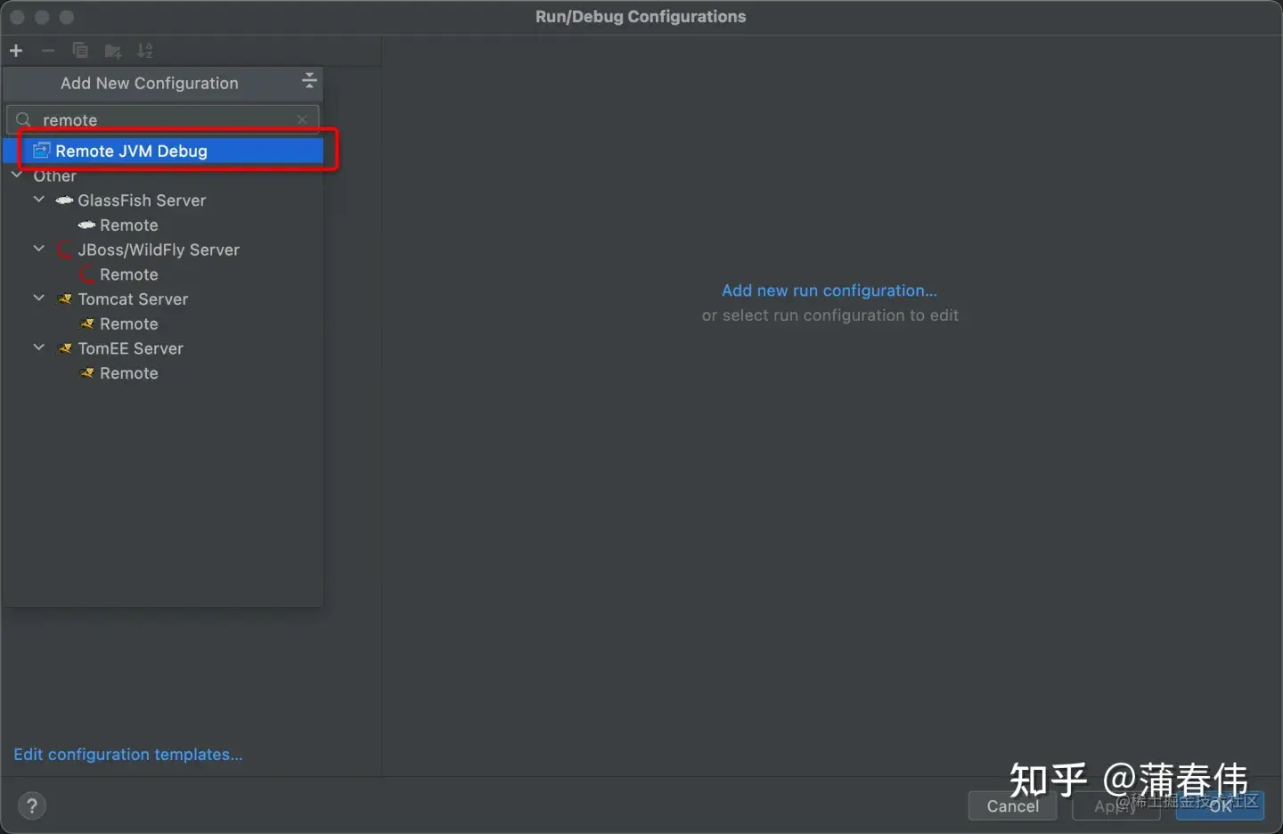 - 在菜单栏选择Run ->Edit Configuration,点击+号,选择Remote JVM Debug,然后在配置项里面输入远程需要调试机器的IP地址和所对应的端口号,最后可以自定义应用名称