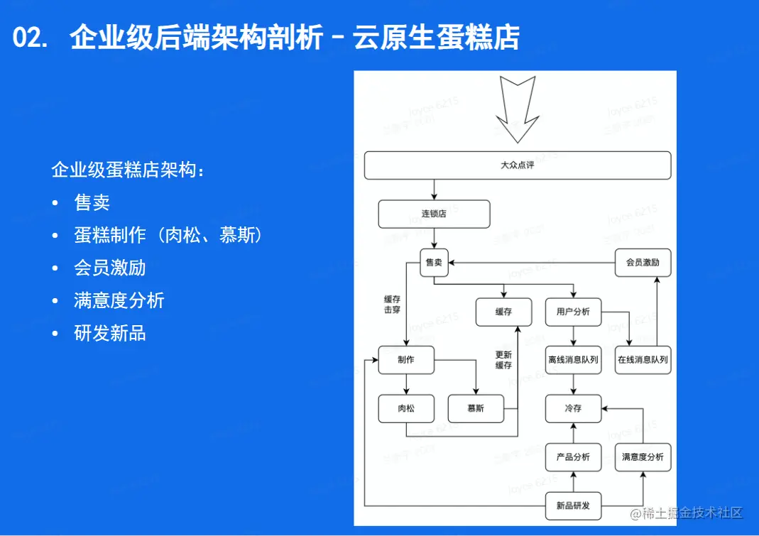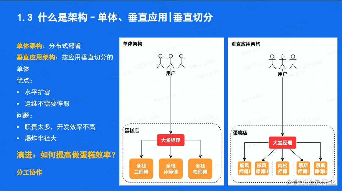 在单体架构基础上,进一步地,再把不同应用的代码从之前一个大的进程中拆分出来,就来到了垂直应用架构。按应用拆分进程,就好比慕斯、戚风等蛋糕在不同的点发配