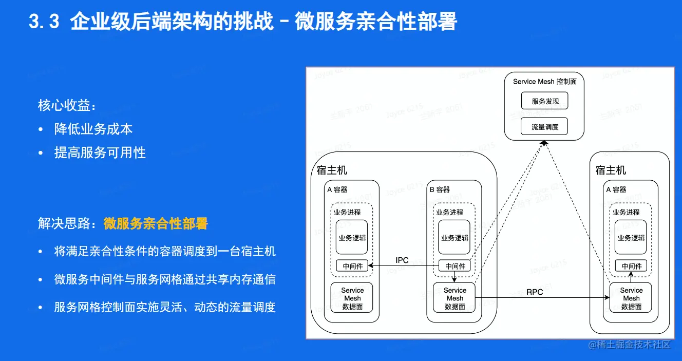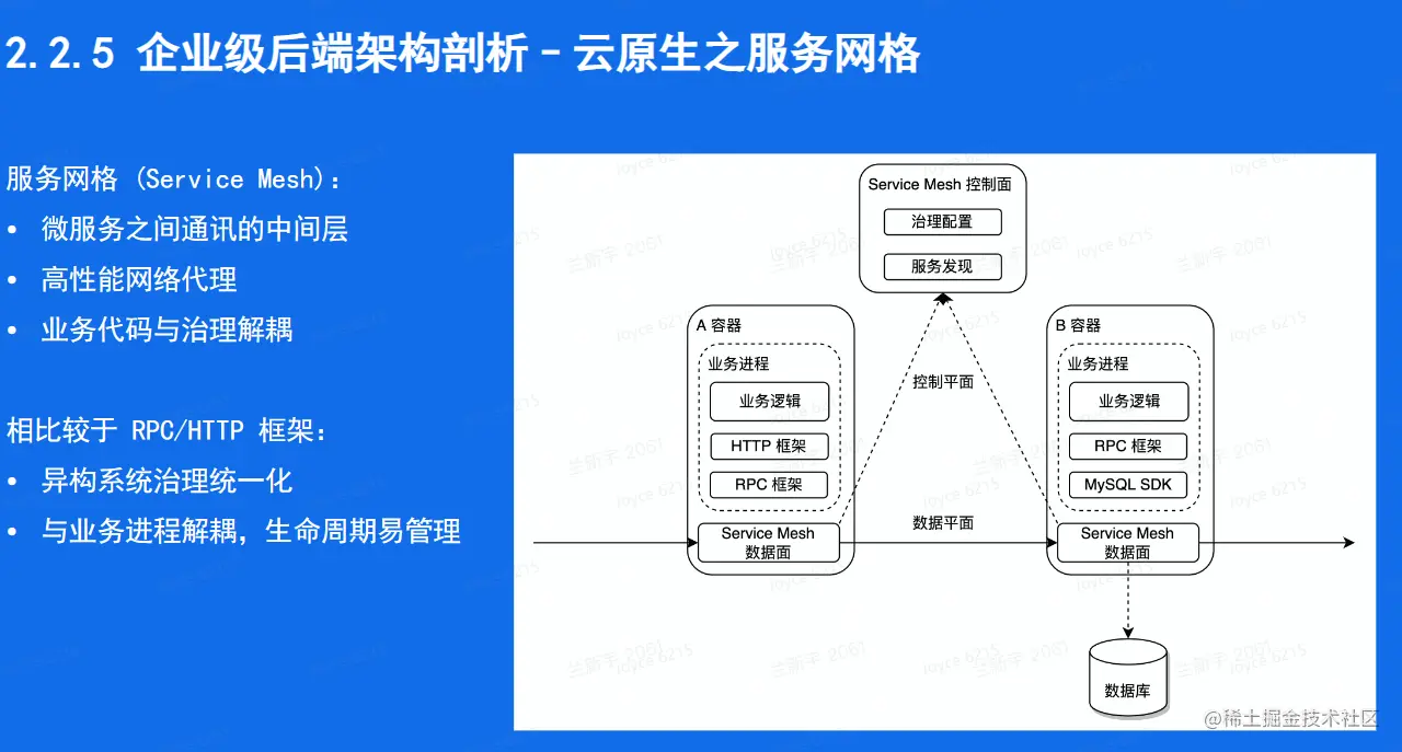服务网格:如果说微服务架构的重要进步,是将庞大的单体服务按照业务功能解耦开来,那么,服务网格的重要进步就是将业务逻辑与网络通信和治理解耦开来。业务不再需要关心异构系统中 RPC 中间件治理能力的不统一,也使得复杂的治理能力的落地成为可能