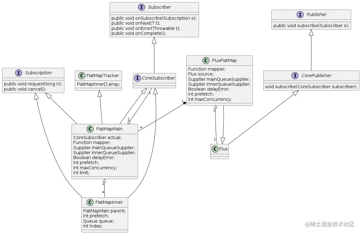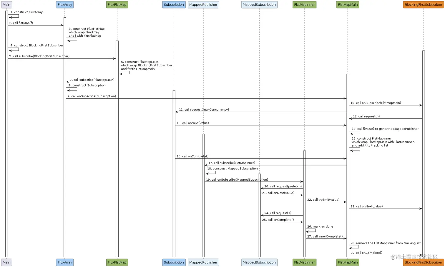 FluxFlatMap.subscribe(BlockingFirstSubscriber)订阅`FluxFlatMap。 FluxFlatMap创建FlatMapMain实例,它包含了BlockingFirstSubscriber和f。FluxFlatMap调用FluxArray.subscribe(FlatMapMain)订阅FluxArray。FluxArray创建Subscription实例。FluxArray调用FlatMapMain.onSubscribe(Subscription)来通知FlatMapMain订阅成功。FlatMapMain调用BlockingFirstSubscriber.onSubscribe(FlatMapMain)来通知BlockingFirstSubscriber订阅成功,这里FlatMapMain既是一个Subscriber,也是一个Subscription。FlatMapMain调用Subscription.request(maxConcurrency)来请求数据,其大小为flatMap允许的最大并行数。该调用不需要等待BlockingFirstSubscriber调用FlatMapMain.request(n),因为FlatMapMain需要先将Subscription发送的数据转换为新的Publisher,然后才能将新的Publisher数据发给BlockingFirstSubscriber,所以转换过程可以提前发生。BlockingFirstSubscriber调用FlatMapMain.request(n)来请求固定大小的数据,该调用可发生多次。Subscription调用FlatMapMain.onNext(value)来向FlatMapMain发布数据,该调用可发生多次。FlatMapMain调用f(value)来对数据进行转换,生成新的Publisher,这里我们将其命名为MappedPublisher。FlatMapMain生成一个FlatMapInner,并使用一个数组来管理所有的FlatMapInner。- 在数据发布结束时,