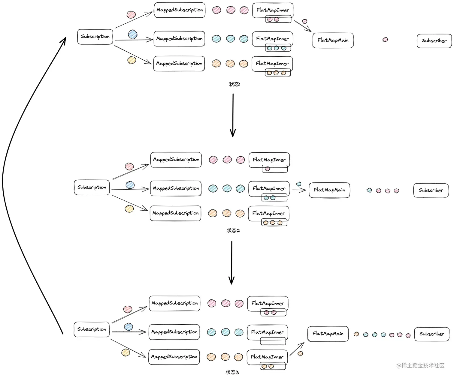 这里我们假设Subscription发布了三个元素,每个元素都生成了一个MappedSubscription且都有一个FlatMapInner订阅了它,三个FlatMapInner都在调用FlatMapMain.tryEmit发布数据。