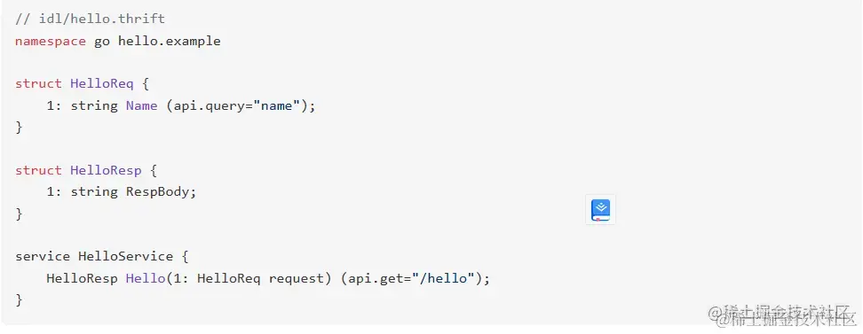 - 首先,定义 IDL,这里使用 Thrift 作为 IDL 的定义(也支持使用 Protobuf 定义的 IDL),编写一个名为 Demo 的 service。这个服务有一个 API: Hello,它的请求参数是一个 query,响应是一个包含一个 RespBody 字段的 Json。