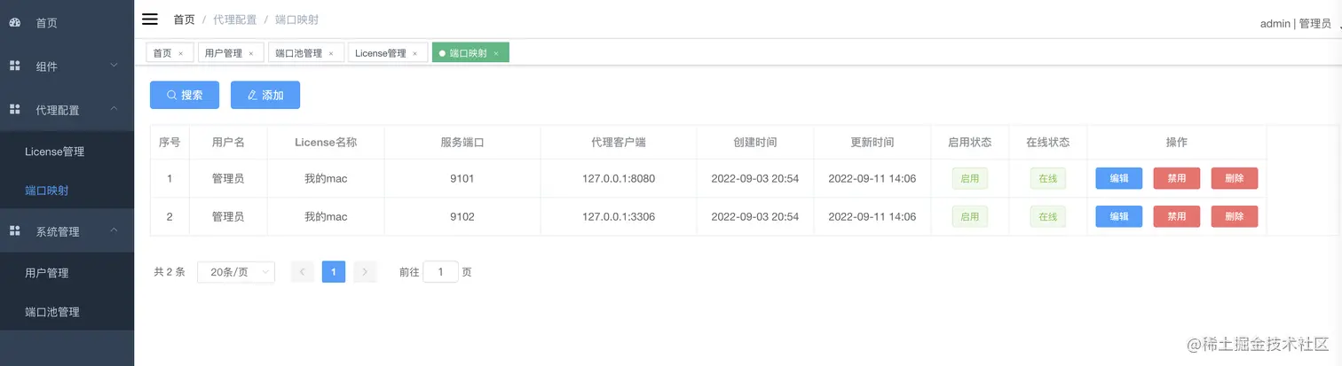 比如现在有一个license:a123456,该license配置了一个或多个端口映射,其中包含9010到localhost:8080的映射(localhost表示代理客户端所在主机的端口,可以换成客户端所在局域网的任何IP)。此时修改客户端配置的服务端ip、license等启动客户端,就可以开启代理了,端口映射管理对应的记录在线状态为"在线"则证明代理成功建立。