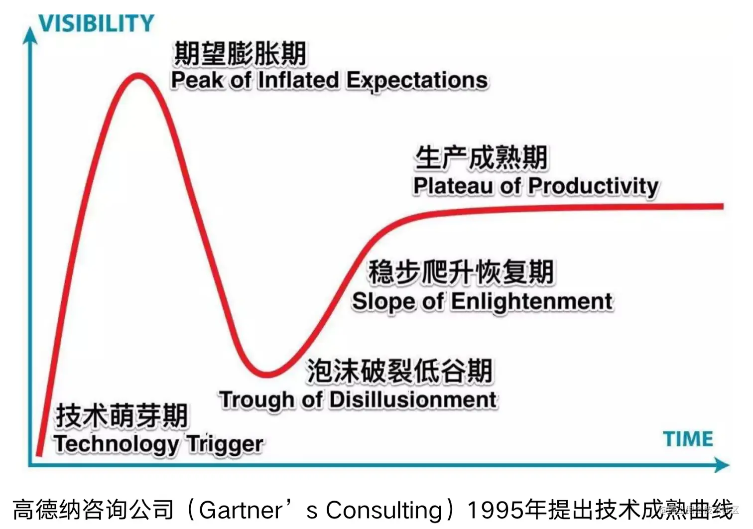 但说到这里,有的小伙伴会很好奇,既然”元宇宙“的概念已经提出了挺长时间,为什么现在才火起来?其实这主要是因为提出这个概念的时候,还不具备实现的技术基础!就好比”人类飞行“的想法在古代就有了,但直到近代才发明了飞机等飞行设备。也就是说,任何技术都有一个成熟曲线,如下图所示: