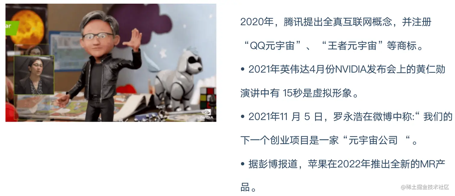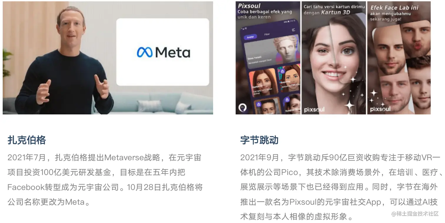 2021年7月,Facebook的老板扎克伯格提出了Metaverse战略,计划在五年内把Facebook转型为一家元宇宙公司,宣布投资100亿美元用于研发元宇宙技术,并在10月28日将Facebook更名为Meta。