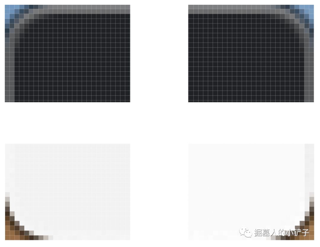 也就是说,我的浏览器窗口四个角的颜色是我的桌面壁纸的颜色,我通过 Photoshop 放大截图,证明了四个角确实如此。