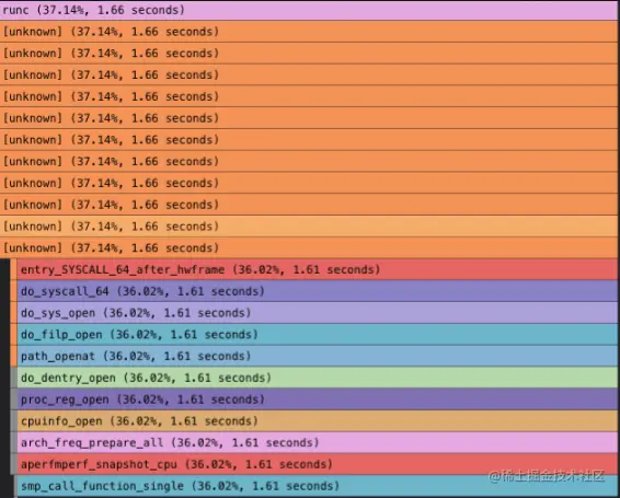 由于是个别 CPU 的短暂抖动,因此我们对某一 CPU 上的执行情况做 profiling。我们看到网络抖动时间点,runc 在读 /proc/cpuinfo 信息,“smp_call_function_single”核间call 存在热点,跟我们看到的 sys 偶尔高现象也能吻合。