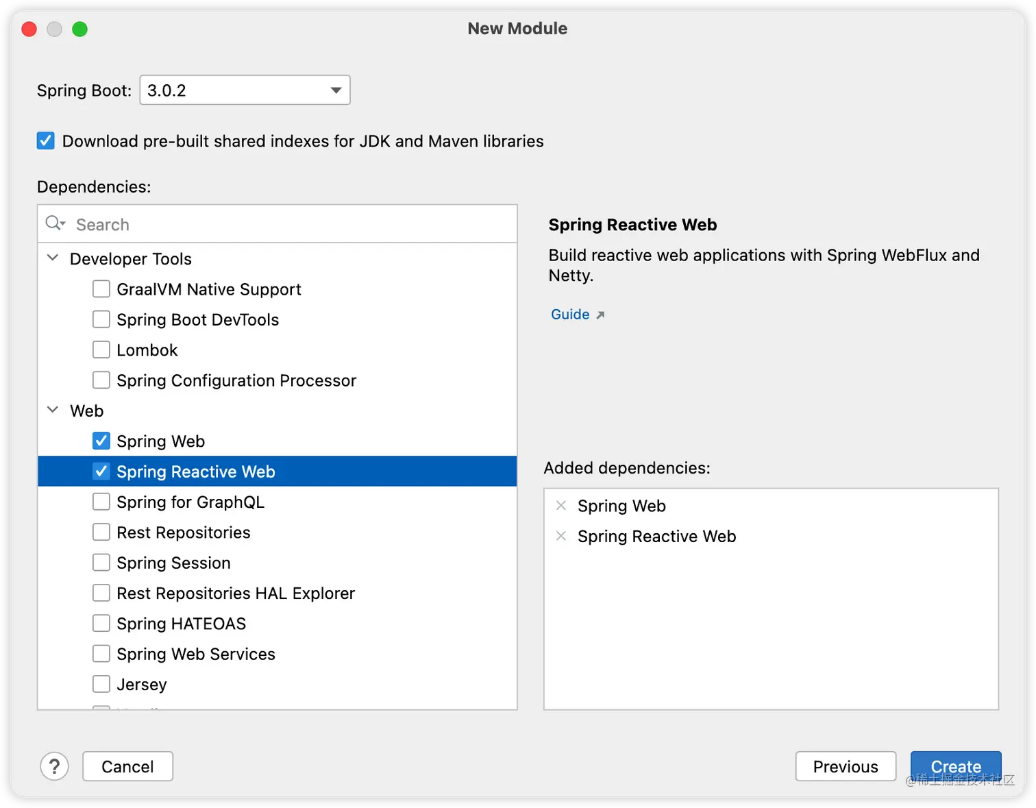 首先我们来创建 client 这个项目,大家注意,创建的时候我们不仅需要添加 Web 依赖,还需要 Reactive Web,因为这个 @HttpExchange 底层基于 WebClient,而 WebClient 则是 Reactive Web 提供的: