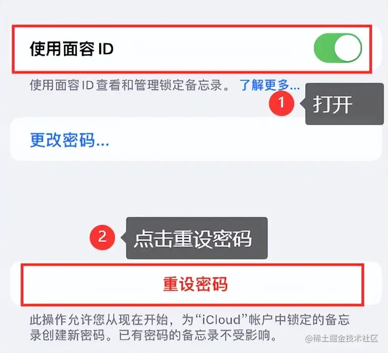 **步骤3:**进入【密码】界面后,首先把上方的【使用面容ID】的功能打开,接着选择下方的【重设密码】。