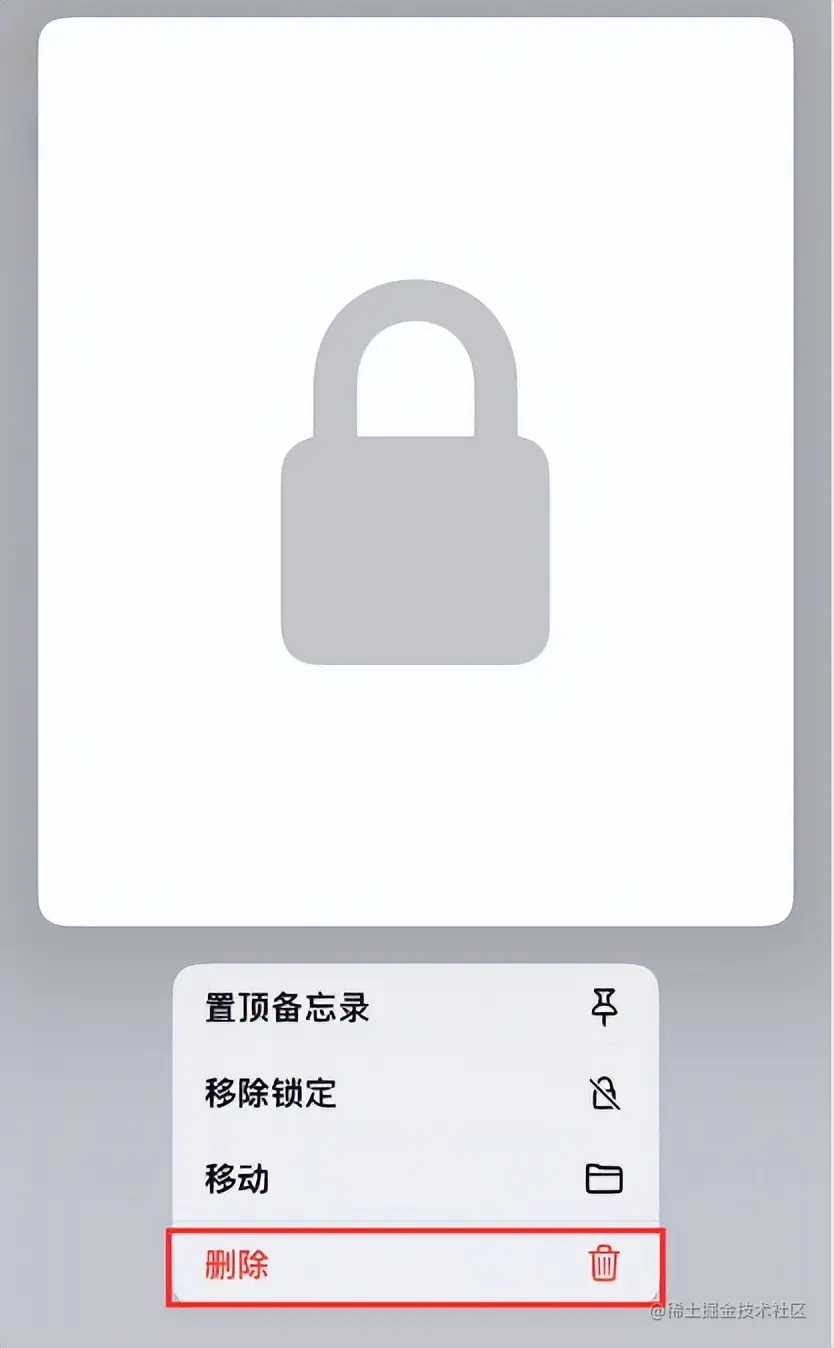 **步骤4:**打开【备忘录】,长按忘记密码的备忘录,将其删除。