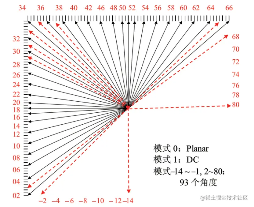 H.266/VVC亮度帧内预测单元还包含矩形模式,考虑到方便矩形的宽角度帧内预测(Wide Angle Intra Prediction, WAIP)模式,H.266/VVC的帧内预测在65种方向的基础上分别增加了-1到-14和67到80方向,共28个方向,这样H.266/VVC帧内预测编码总共有93个方向。
