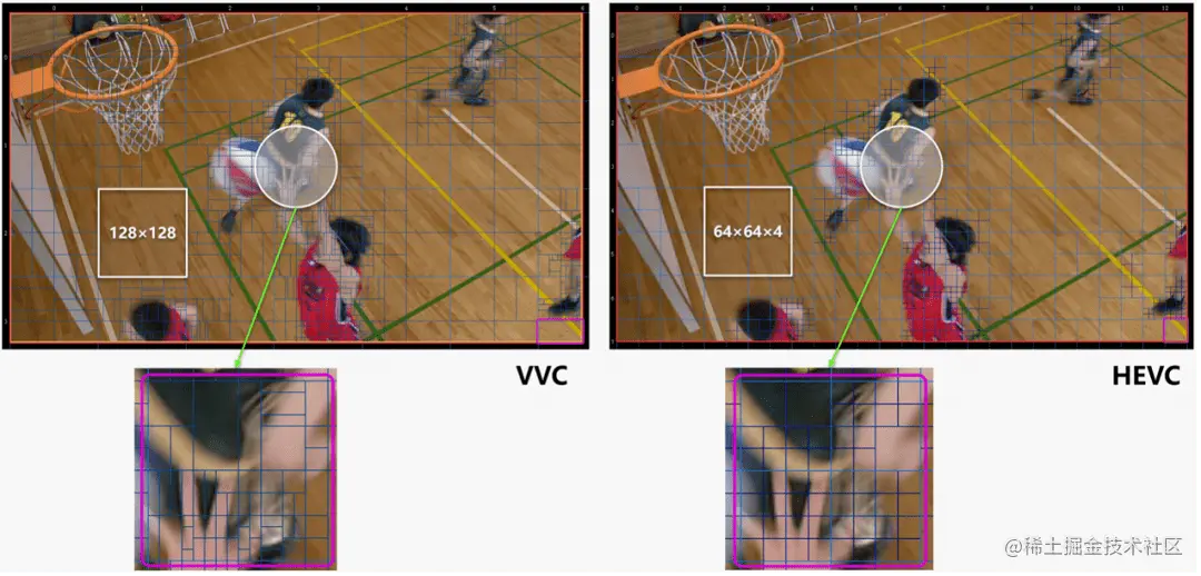下图显示了H.266/VVC与H.265/HEVC两代标准块划分方式的不同。