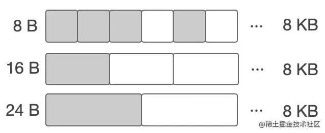 - 先将内存划分成大块,例如 8 KB,称作 mspan