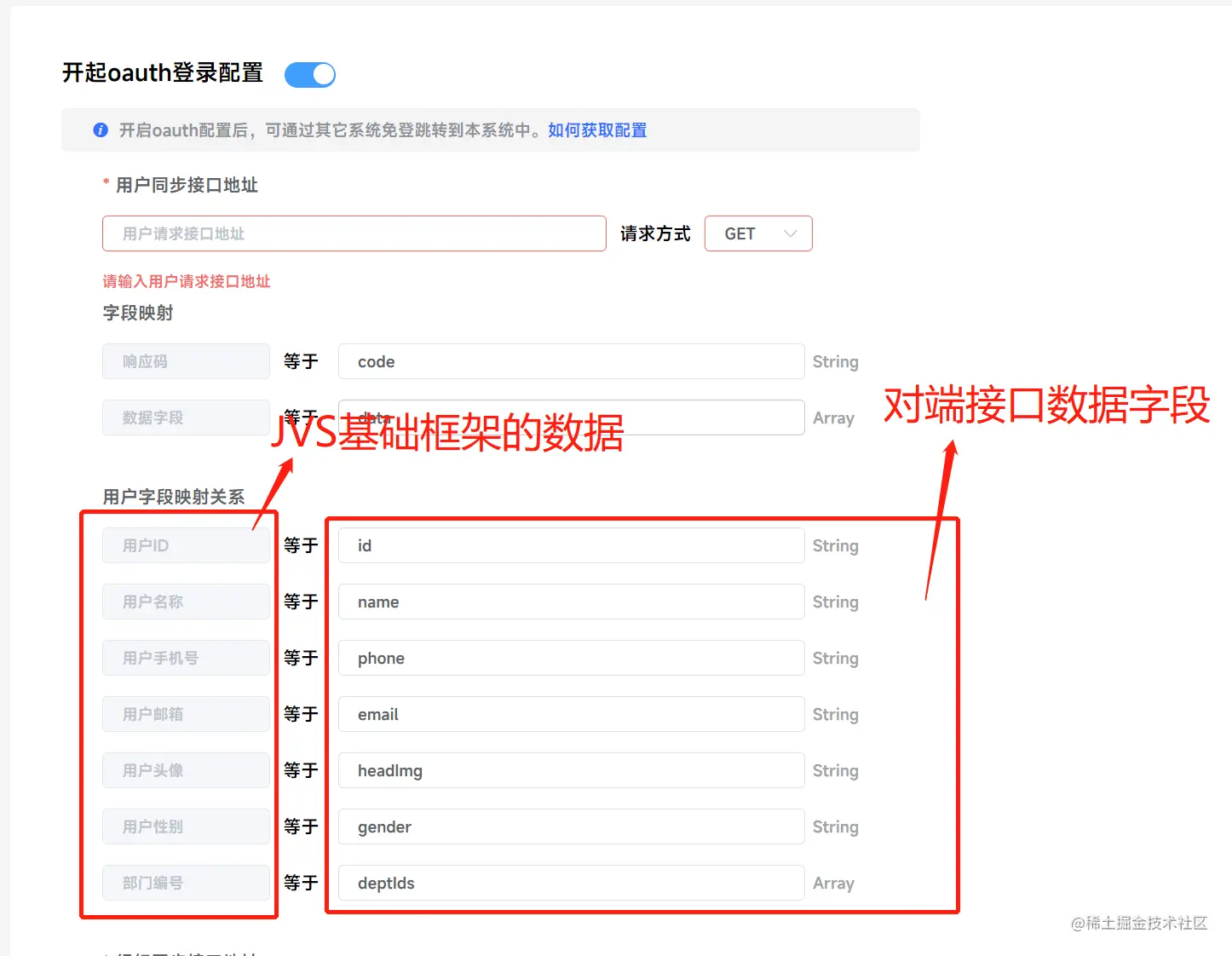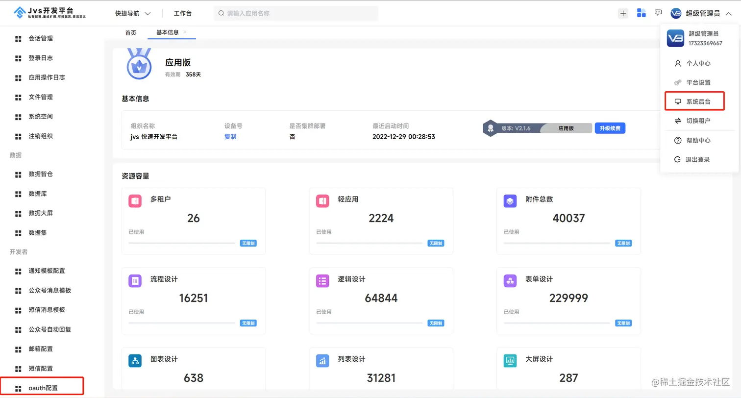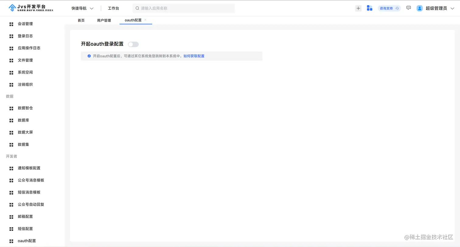 在JVS平台打开系统后台,点击oauth配置,系统默认为关闭状态,打开配置开关,进行配置。