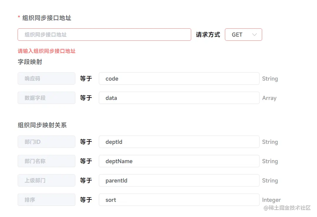 输入组织架构接口地址,并选择请求方式GET或POST,必填项,用于手动同步并更新用户组织架构信息。