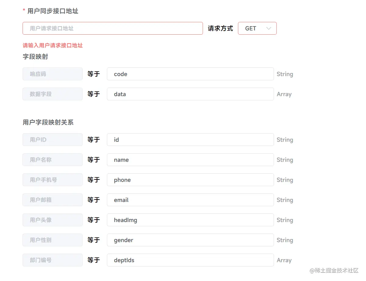 输入用户接口地址,并选择请求方式GET或POST,必填项,用于手动同步并更新用户管理列表中用户信息。
