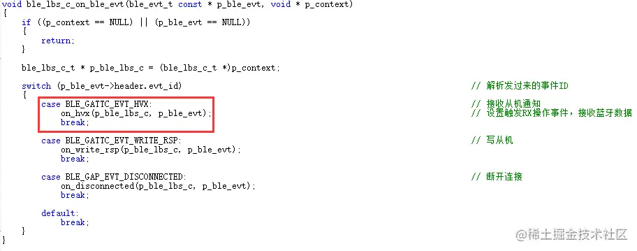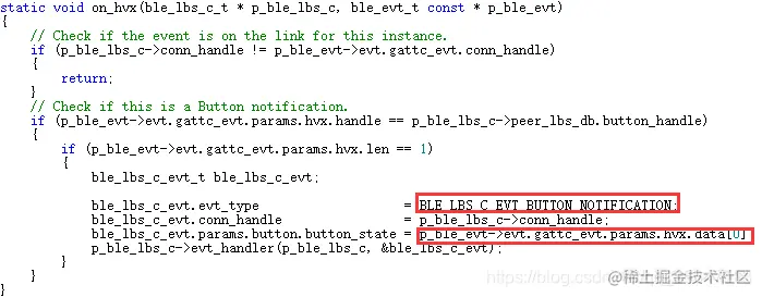 on_hvx 函数最终处理接收到的从机通知数据,触发数据类型为按键通知 BLE_LBS_C_EVT_BUTTON_NOTIFICATION ,操作句柄为 p_ble_lbs_c->conn_handle,数据存 ble_lbs_c_evt.params.button.button_state 中