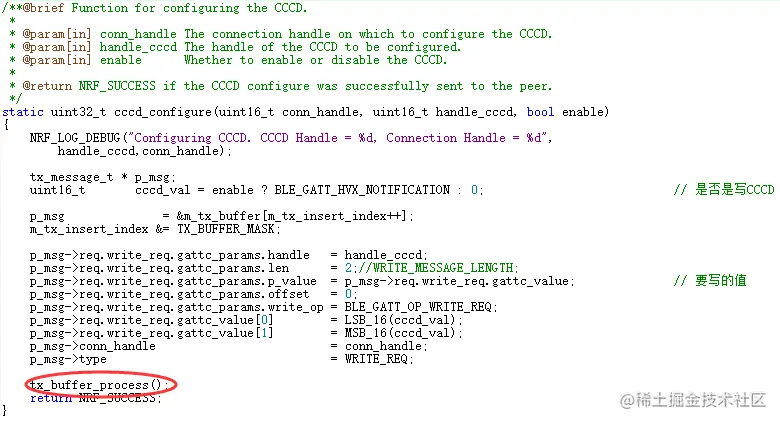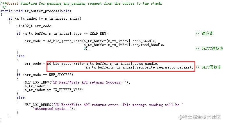 把主机按键状态作为数据写入到从机,通过 i 的值控制不同的从机。tx_buffer_process 这个函数就是前面通知使能中使用主机 cccd 写函数,这里同样可以作为写数据使用。