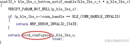 进入按键通知使能服务 ble_lbs_c_button_notif_enable 函数内部,使能通知实际上就是 CCCD 的写操作,实际上就是通过协议栈函数 sd_ble_gattc_write 来实现 CCCD 的写入