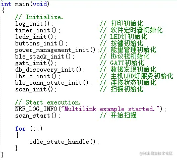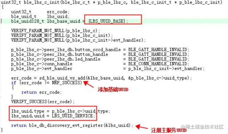 通过 ble_lbs_c_init 函数实现主机初始化,这个函数是一个数据结构体类型,通过 i 的不同值,来分别代表不同的从机链路。这个函数被称为客户端处理事件初始化函数。首先设置一个基础 UUID,这个基础 UUID 通过协议栈函数 sd_ble_uuid_vs_add 赋值给主设备。然后通过调用注册函数 ble_db_discovery_evt_register 通过 UUID 查出对应的服务。如果基础 UUID 相同,则会启动里面的回调函数 db_discovery_evt_handler 进行操作。