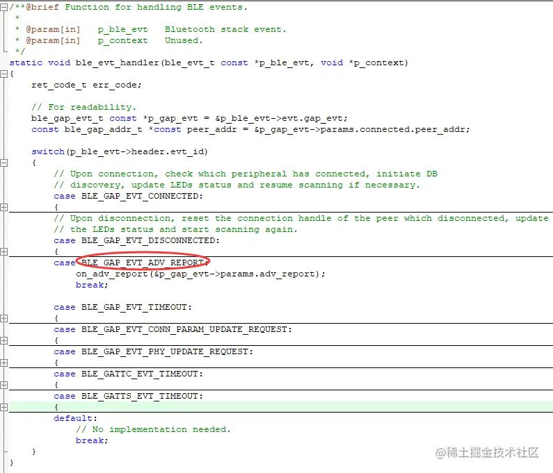 在 ble_evt_handler() 函数中添加 BLE_GAP_EVT_ADV_REPORT 事件,如果发现了从机广播,则产生 BLE_GAP_EVT_ADV_REPORT 事件,也就是广播报告,那么久调用 on_adv_report() 函数解析广播。