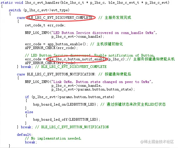 当发现主服务完成后 BLE_LBS_C_EVT_DISCOVERY_COMPLETE,启动主机使能从机的通知。